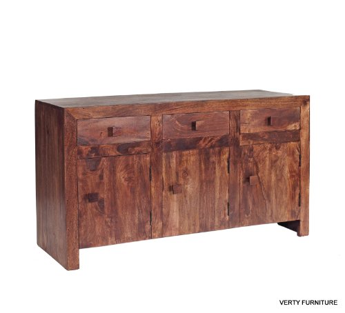 This beautiful Dakota style cube large sideboard features 3 doors and 3 drawers offering plently of storage space and is hand made from 100% mango hardwood by skilled craftsmen in our factory in India using the finest quality materials.