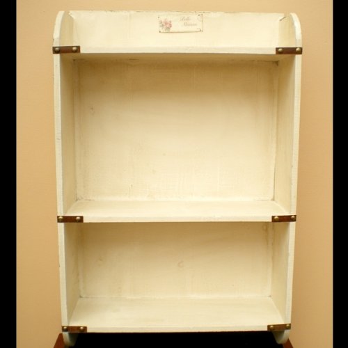 Charming set of vintage style cream wall shelves. Three shelves with antiqued brass decorative edging to just the corners of each shelf. The cream paint finish is distressed for that authentic vintage look. Small metal plaque to the top centre reads "Belle Maison" with pink flowers.